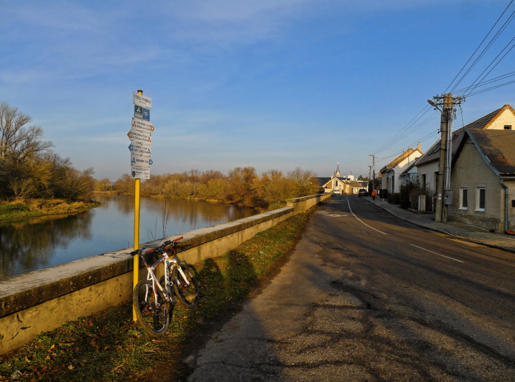 Križujem hlavnú cestu Moravský Svätý Ján – Hohenau, pár metrov vľavo je jediné pevné cestné spojenie s Rakúskom v primoravskom hraničnom úseku. Blatový úsek pokračuje, škoda. Rovnako vľavo sa nachádza odbočka na Trojmedzie, spoločnú hranicu Rakúska, Českej republiky a Slovenska a zároveň sútok Moravy a Dyje. Nepríjemné úseky pominú, pred sebou mám doslova výstup na most cez rieku Myjava. Netradičný mostík je pomerne efektný. Hrádza pokračuje dobrým povrchom. Podchádzam diaľnicu D2 a po dlhšom čase vidím rieku Morava. V jej upravenom a pôsobivom koryte. Zároveň ide o jednu z mála možností ako prejsť do susednej Českej republiky.