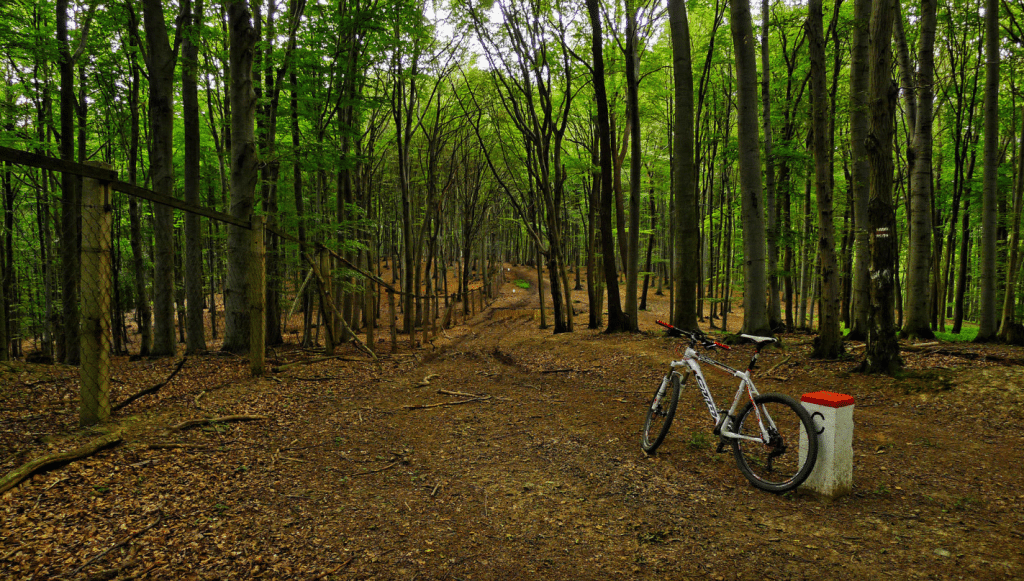 Na konci stúpania som bol pred dvomi rokmi, pamätám si to tu. Namiesto pokračovania dobrou lesnou cestou k Hošteckej studničke, začínam vymýšľať a idem radšej málo výraznou cestou. Samozrejme klesám a cesta končí krmelcom. Čo teraz? Späť sa mi nechce ísť. Idem pešo krížom cez les s nádejou, že sa o chvíľu napojím na asfaltku smerujúcu na vrchol Zámčiska. Lenže do cesty sa mi postaví množstvo chodníčkov. Zaujímavé, čo zver dokáže vytvoriť. Ale mohlo by to byť aj od motorkárov. Nasadám a veziem sa. Vrstevnicovo, pohodlne a v tieni lesa. Neblížim sa k asfaltke, naopak, chodník sa delí, jedna vetva vpravo, druhá vľavo. Napájam sa na lesnú cestu, ktorou stúpam a z lesa vychádzam kúsok od miesta, kde som pred chvíľou bol. Neprekáža.