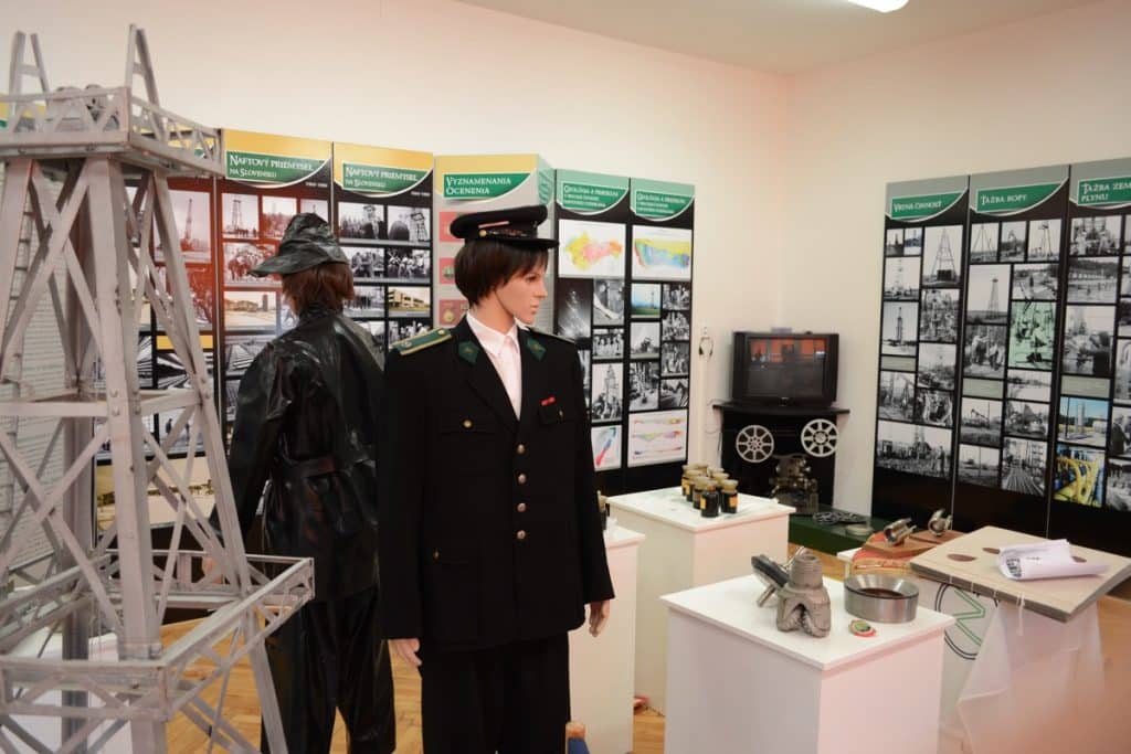 Nechýbajú ani technické časti vrtných súprav, ukážka ropy, figuríny oblečené do naftárskych oblekov či makety vrtných veží.