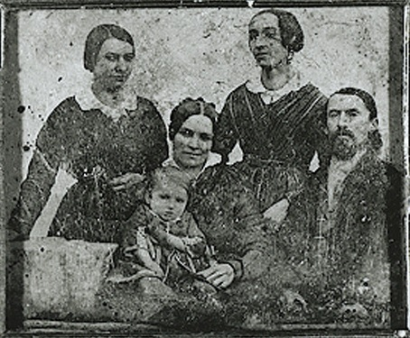 Samuel Jurkovič s dcérami Julianou, Annou, Emíliou a vnukom Svetozárom Hurbanom – Vajanským na dagerotypii z roku 1849 (ALU SNK, Sign. K 4a/51).