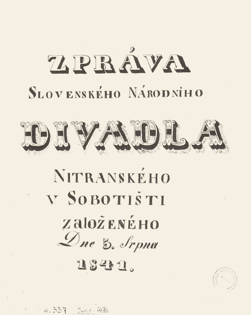 116-stranová rukopisná kronika Samuela Jurkoviča Správa Slovenského národného divadla nitrianskeho… – cenný doklad začiatkov slovenského divadelníctva (ALU SNK, Sign. 10 B 1).