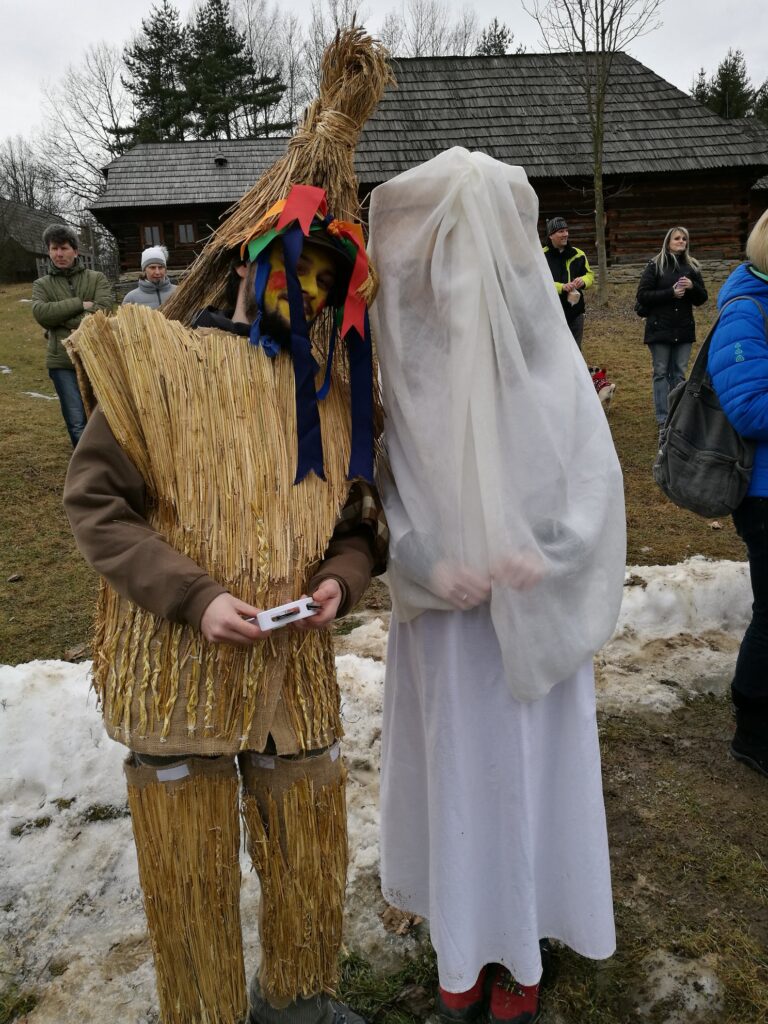 Slameníka – postavu obmotanú slamou, ktorá predstavovala úrodu a bohatstvo.
