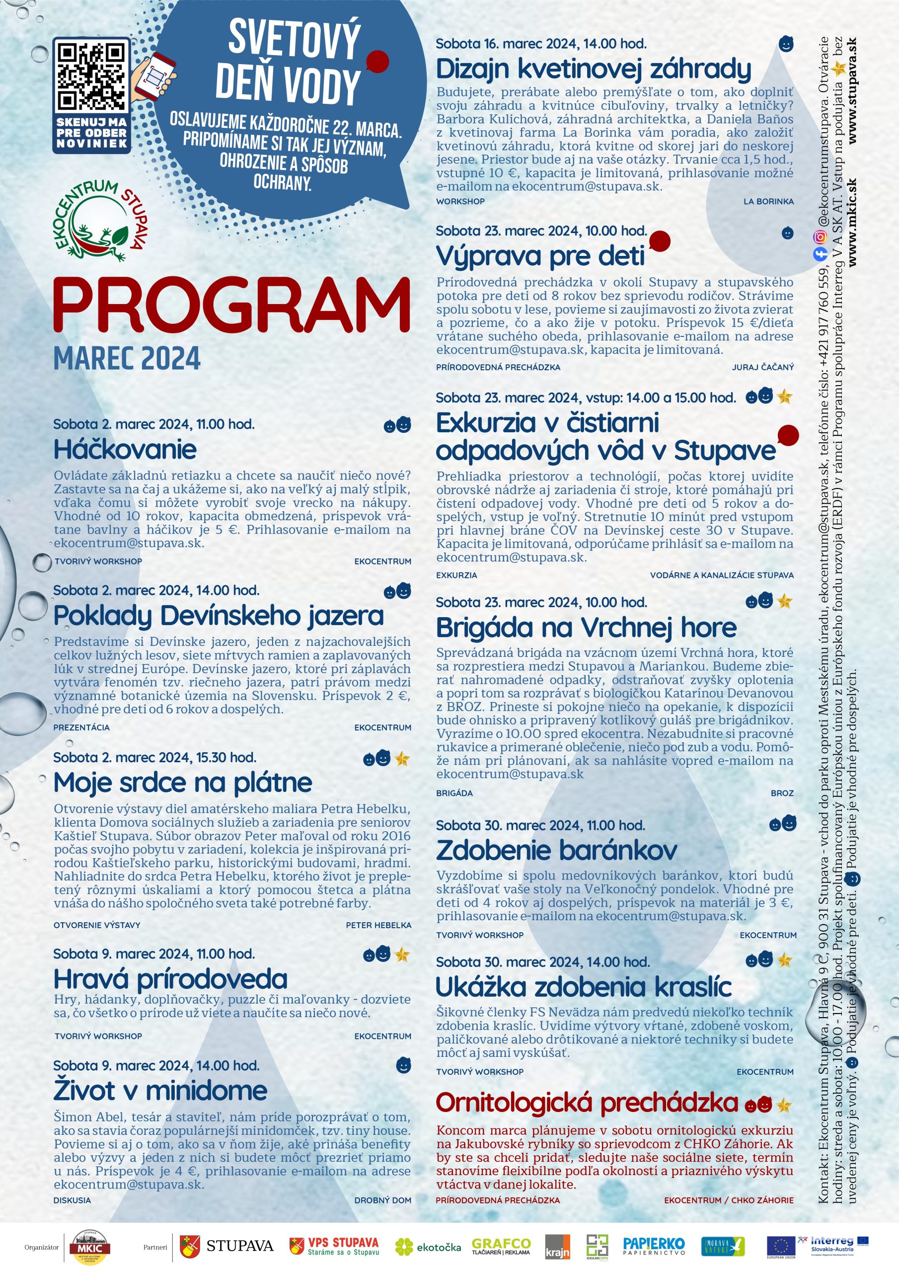 | V marci vás čaká pestrý program. Budete tvoriť, venovať sa vzácnym lokalitám, spoznáte život minidome alebo naplánujete kvetinovú záhradu. Deti si môžu užiť výpravu s prírodovedcom a pred Veľkou nocou ich čaká aj zdobenie baránkov. Na sviatky sa môžete nechať inšpirovať aj vy a pozrieť si, ako sa zdobia kraslice rôznymi technikami. V marci máme aj Svetový deň vody, takže si ho pripomenieme aj v ekocentre. Nevynechajte ani brigádu na Vrchnej hore, území európskeho významu v tesnom dotyku Stupavy, počas ktorej vás bude sprevádzať botanička a v cieli vás počká kotlíkový guláš. |
