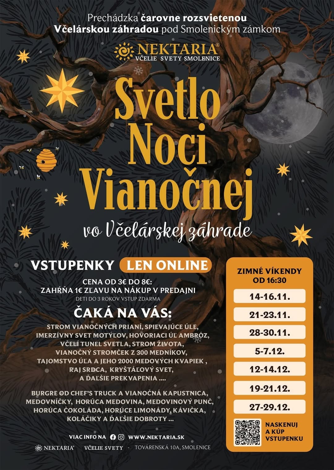 Svetlo Noci Vianočnej vo Včelárskej záhrade pod Smolenickým zámkom + Add to Google Calendar + iCal / Outlook export The event is finished. Date Pi 11 2025 - Po 12 2025 Expired! Time 16:30 - 21:00 Share this event