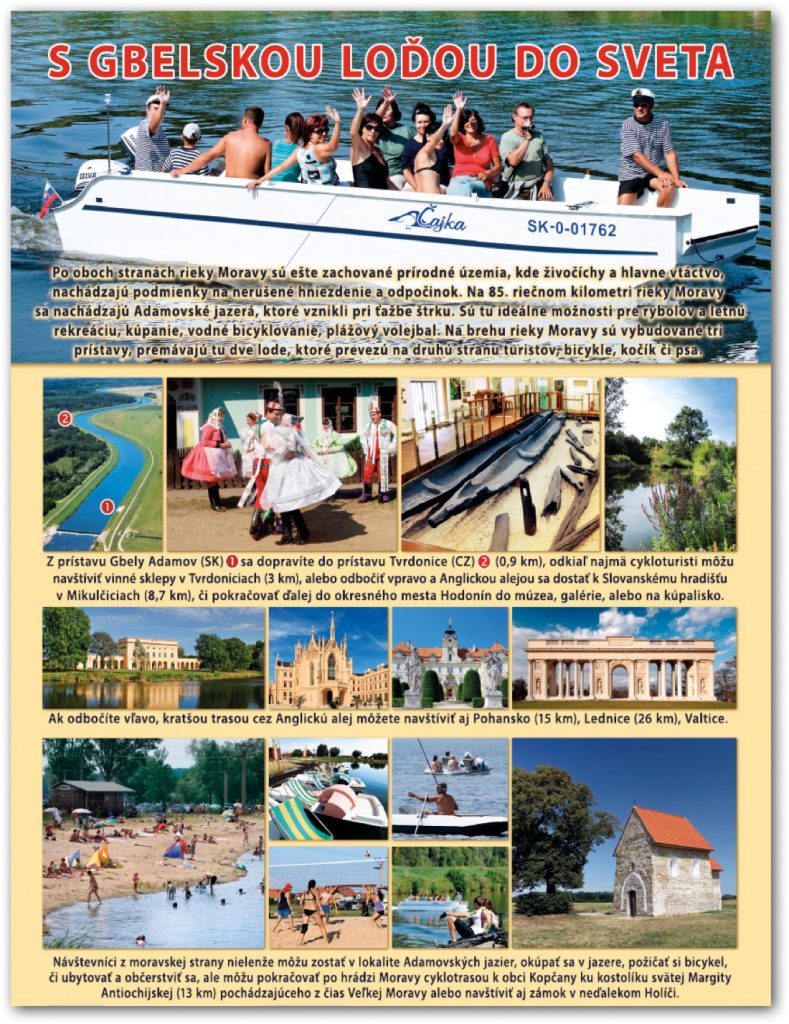Mesto Gbely v spolupráci s českou obcou Tvrdonice sa v roku 2012 pustili do projektu pod názvom „Rieka Morava nás nerozdeľuje, ale spája“. V rámci tohto projektu sa realizujú vyhliadkové plavby po rieke Morave. Vybudovali sa tu dva prístavy na slovenskom brehu v obci Gbely-Adamov a Kopčany a na českom brehu pri moravskej obci Tvrdonice.